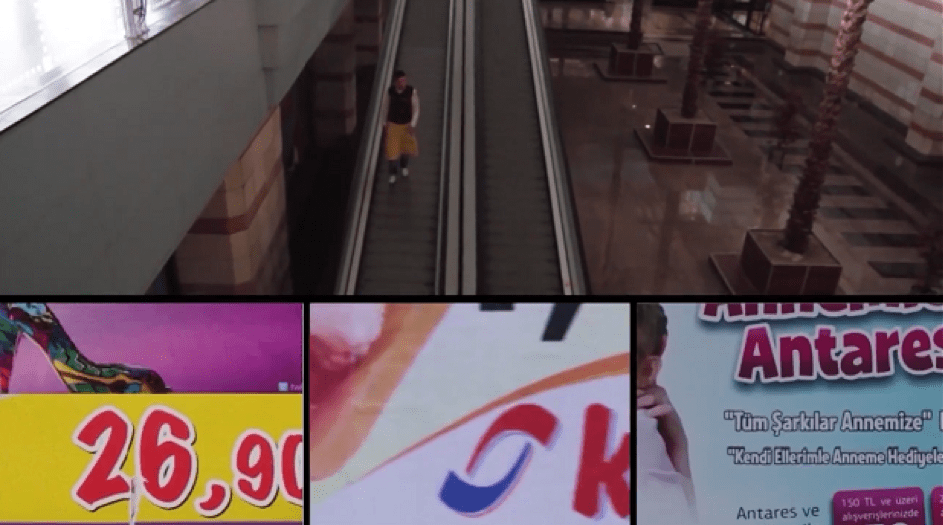 Yukarıdaki ekran görüntüsünde görüldüğü gibi, kameranın AVM’ye girdiği yerlerin bir kısmında ekran dört parçaya bölünerek Simmel’in “parçalanmış metropoller” fikri imaja aktarılmaya çalışılıyor.