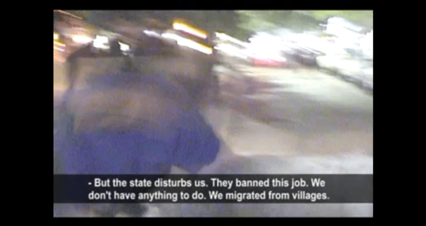 Bu sahneden kısa bir süre sonra, belgeselcinin sorduğu soruların niteliği tartışmasına geri döneriz. Aşağıdaki iki ekran görüntüsü, Alper Şen’e, videonun çekiminde yardım eden (kağıtçıları tanıdığı için onu kağıt toplayıcılarının yaşam alanına dahil edebilen) adama Alper Şen’in sorduğu soruları görüyoruz. Kendisinin anlatacak bir şeyi olmadığını, iş-ev-hayat koşuşturması ile sürüklendiğini ve dolayısıyla sıradan bir hayatının olduğunu söyleyen adam, Şen’e, kağıtçı çocukların hayatlarının “ilginç”, dolayısıyla anlatılmaya/ gösterilmeye değer olduğunu ima ediyor. Şen ise karşılığında, Ankara’da kağıt toplayan insanların neredeyse tamamının 1994 yılında köyleri Ördekli/ Kotranıs, Hakkari’nin yakılmasıyla oradan atılıp zorunlu göçe tabi tutulanlar olmasına referansla şunu soruyor: “Askerlerin gelip seni köyünden atması ilginç mi?”. Sonrasında pek çok soruyu peşi sıra sorarak (en sonunda “Senin yolun doğru yol mu?” diye soruyor) adamı öyle bir sıkıştırıyor ki, elini gerçekle kirletmeyen ve gerçeklik karşısında steril algıları olan birisi bunu, tarafsızlığı ihlal ettiği gerekçesiyle yerden yere vuracaktır. “İlginçlik”, yorumu yapan adam tarafından gelişigüzel kullanılmış olsa da Şen’in bunu pejoratif anlamda kullandığı (insanların hayatı üzerinden gösteriş yapmak amaçlı takınılan turistik bakışa getirdiği eleştiriler düşünülünce) açık. Türkiye’nin belgeselleri örnekleri arasında, özellikle 2000’ler sonrasında mağdur edilmiş, zorunlu göçe, soykırıma maruz kalmış insanların tecrübe ve tanıklıklarının aktarılması yaygınlık kazandı. Peki bu hayatları “ilginç olduğu için anlatmak” ile anlamak/ eylemli bir tanıklık haline dönüştürerek anlatmak arasında nasıl bir fark olabilir? Arada etik bir tutum farkı olduğu çok açık, ancak bu farkın biçimsel tezahürleri nelerdir? Videobelgesel üzerine yorumumun geri kalan kısmını bu sorulara ayıracağım.