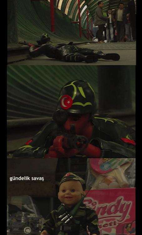 Bu videonun, Artıkişler Kolektifi’nin diğer işleri arasındaki yeri, belgeselin video sanatıyla sınırının en çok belirsizleştiği işi olmasıdır bana göre. Hem biçimsel özellikleri bakımından (süresi, anlatım tercihleri−üst anlatıya başvurmamak gibi−) hem de estetik olarak video sanatının özelliklerine sahip bir video. Videoda Ankara’nın Kızılay’da ya da Sıhhiye’de olması muhtemel üst geçitlerinde dolaşan kamera, bu üst geçitlerde özellikle 2000’lerin başında çokça yer alan oyuncak dükkanlarının ve seyyar oyuncak satıcıların sattığı asker oyuncaklarını bize aktarıyor. Arka planda gündelik hayatın sesleri ile karışan oyuncakların sesleri, çoğunlukla yakın plan çekimleri ile gördüğümüz bu asker oyuncakların (üst geçitte aceleyle geçen binlerce insan arasındaki tek anlatılması gereken kendileriymiş izlenimini çok rahat vererek) birkaç çocuğun dikkatini çektiğini de görüyoruz videoda. Asker giysileri giydirilmiş ve alakasız bir müzik eşliğinde dans eden oyuncak bebek ise insanı bu oyuncakların gerçekliğini sorgulatan bir kitsch noktası. Bu noktada anlıyoruz ki bu kayıt yalnızca 2000’lerin başında Ankara’nın çoğu üst geçidinde karşılaşılabilecek oyuncakları belgelemek için değil, bu gerçekliğe karşı tutulan sübjektif bir tavrın anlatısı. Artıkişleri Kolektifi için çalışan videocuların Altyazı dergisine verdikleri röportajlarında[4] belgeselin objektif oluşuna inanmadıkları, zaten öyle bir niyetlerinin olmadığı, asıl zor olanın sübjektif bir tavrı yansıtmak olduğunu söylediği düşünülürse, bu kısa videodaki anlatım tercihleri gözümüzde anlam kazanır.