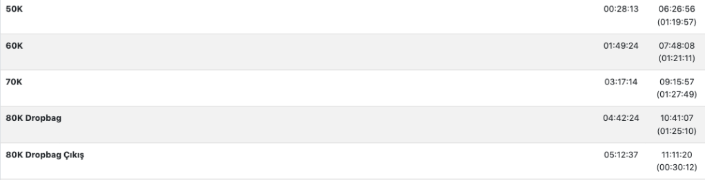 İlk tur bu sürelerle benim için tatmin edici oluyor, keyfim ve enerjim yerinde. Dropbag noktasında hızlıca çorap& t-shirt değişimi, tuvalet ihtiyacı, yayla makarnayı ve hazır çorbayı biraz kaynar suyla ısıtıp yarısını atıştırma, Nuriş ve Tarık ile görüşme ve moral toplama gibi işleri 15 dakikada halledebildim. Yarış günü heyecandan bir şey yiyemediğim için acıkmıştım, tam anlamıyla bir akşam yemeği yedim burada.