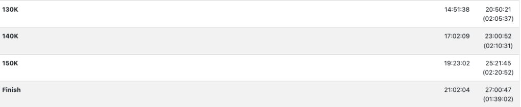 Bu turda, bir önceki turdaki şekilde beslendim, haşlanmış patates mideme çok iyi gelirken kola da dinç tuttu. Daha önce herhangi bir yarışta bu kadar fazla jel kullanmamış olsam da bu turda da 4 jel tüketerek devam ettim. Elektrolit tabletlerini kullanmayı bıraktım, midemi bulandırdı (sadece yarış öncesi ve ilk turda flaska koyduğum kadarıyla tükettim).