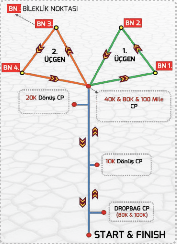 Yarış, yukarıdaki şekilde mavi kısım ile başlıyor, orta noktadaki CP’ye geliniyor, sonra yeşil bayraklarla işaretli üçgen koşulup köşelerdeki mavi ve yeşil bileklikler alınıyor, ortadaki CP’ye getiriliyor; turuncu bayraklarla işaretli üçgen koşulup köşe noktalarındaki kutulara konmuş pembe ve turuncu bileklikler CP’ye getiriliyor, mavi bayraklarla işaretli parkurdan start alanındaki dropbag noktasına dönülüyor. Tüm bunlar 40 km’den biraz fazla. Bunu 4 kez tekrarlıyoruz, dropbag noktasına 3 kez uğramış oluyoruz.