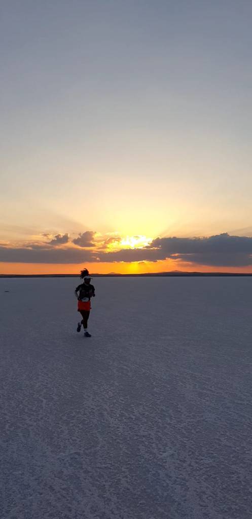 Son tur, 3. Turun son 10 km’si kadar olmasa da zor başladı. Sıcak o kadar zorluyordu ki, özellikle üçgenlerde devam etmek güçleşiyordu. Turuncu üçgene girmeden CP’de yarım saat güneşin biraz olsun batması için bekliyoruz. Bu sırada o üçgenden birkaç 80 km koşucusu bayılıp yarışı bırakmış ve araçlarla alınıyor, bunlara tanık olmak insanın zaten hassas olan moralini etkiliyor. Tuz öyle bir yakıyor ki, yüzümde yanmayı hissediyorum. Güneş kremini daha sık tazelemeliydim, oysaki ben bir defa sürdüm ama yeterli olmadığı şu noktadan itibaren kendini hissettirdi. El parmaklarımda hayatımda hiç görmediğim seviyede ödem oluşuyor, biraz komik bir görüntü, sorun yaratmasa da tedirgin ediyor. Jelleri bu kadar tüketmeye alışkın olmamama bağladım bu ödemi, bu turda tüketmedim ödem cidden indi. Bileklik noktalarında bileklikler tükenmiş, bulduğumuz bileklikleri alıp getiriyoruz CP’lere. Turuncu üçgenin sonuna doğru devam ederken birlikte koştuğumuz Evren ve Fıratali ile koşuya geçiyoruz. Nasıl yapabildiğimizi kendimiz de anlayamayıp Fıratali ile birbirimizin fotoğrafını çekiyoruz.